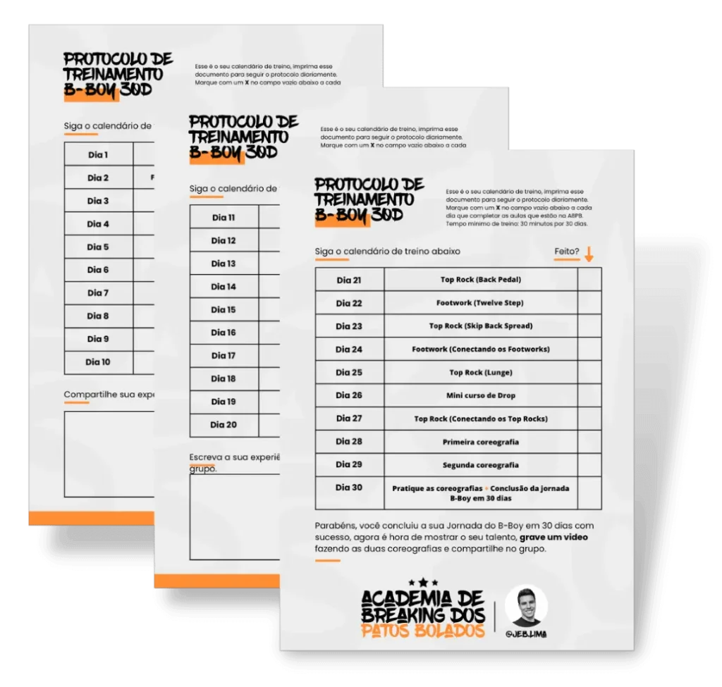 Você vai receber um pacote com aulas gravadas e estruturadas do básico ao intermediário. Mais um guia de treinamento para você aprender a dançar Breaking em incríveis 30 dias do absoluto zero.